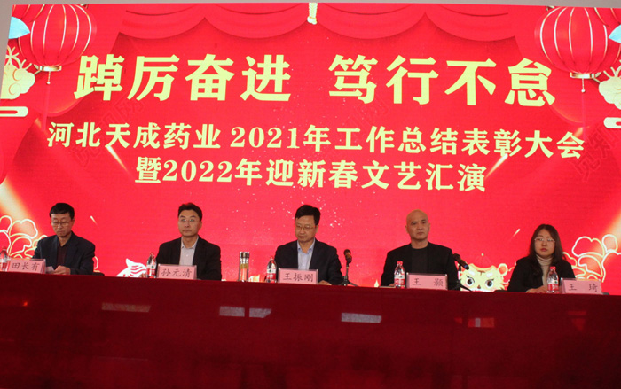 2021年已然过去,回顾这一年,我们与党同庆百年华诞,我们细数党和人民取得的累累硕果。盘点这一年,天成药业紧跟党的领导,在践行“制好药,为人民”的征途上,戮力同心,奋勇拼搏,攻坚克难,天成人同样取得了令人欣慰的成绩。站在两个百年交汇处,感悟百年光辉史,赓续奋斗写华章。为丰富职工文化生活,营造喜庆、感恩。拼搏的文化氛围,展现天成药业奋发有为的精神风貌,1月25日, 公司举办了“踔回奋进.笃行不息。一起向未来”--2021年工作表彰大会暨2022年迎新春职工文艺汇演活动。工作总结大会上30余个集体或班组以及100余名干部员工受到了表彰。