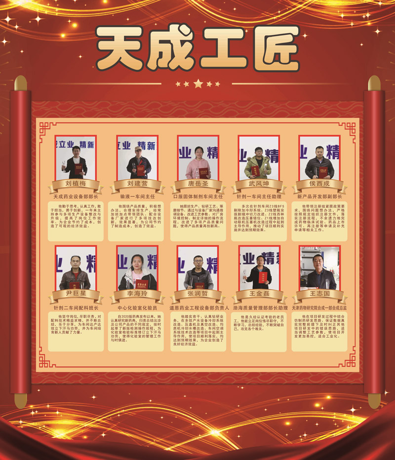 刘植梅:天成药业设备部部长,他勤于思考,认真工作,敢于担当,勇于创新,一年来主持参与多项生产设备整改与升级,提高了岗位工作效率、为企业节约了成本,创造了可观的经济效益。